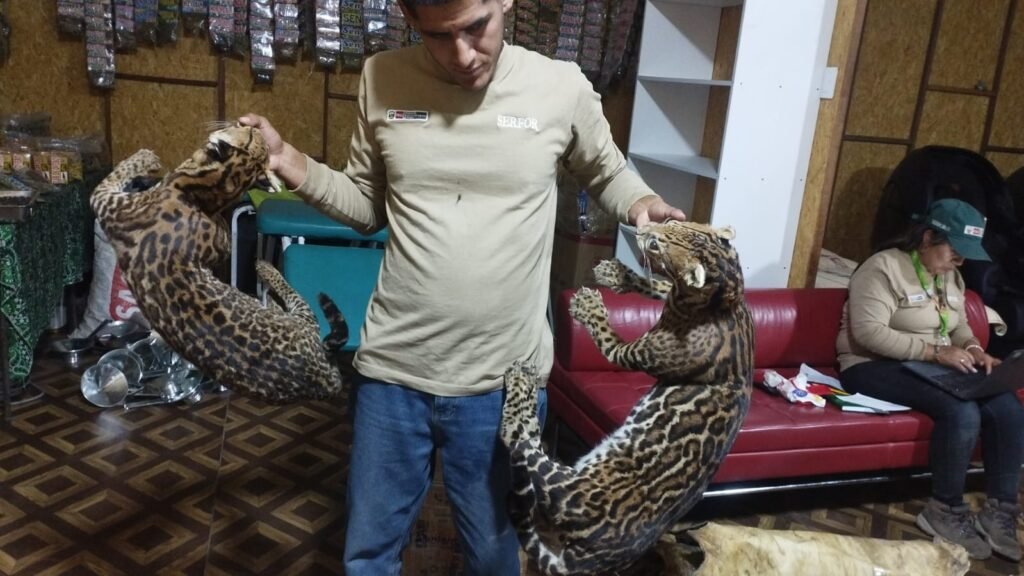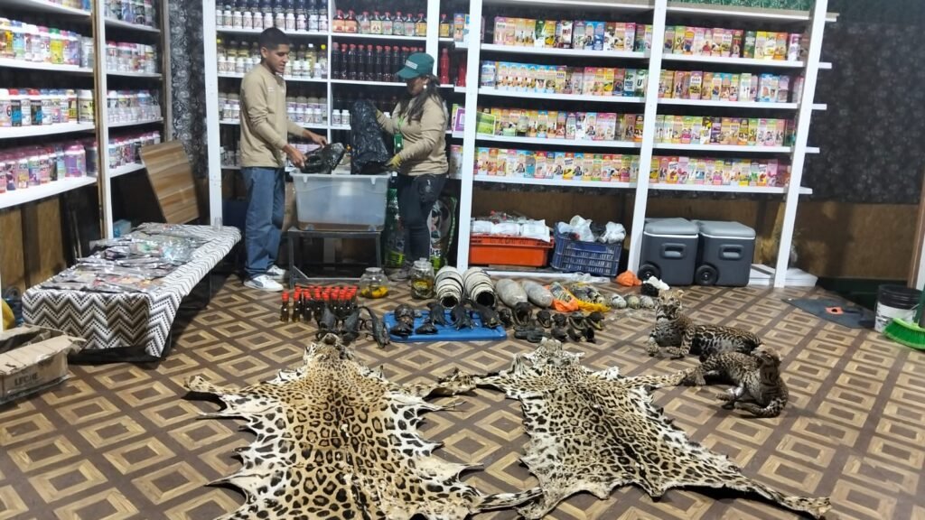 En paralelo, en un local de medicina alternativa ubicado en el centro de la ciudad, se decomisaron restos de fauna silvestre de alto valor, entre ellos pieles y extremidades de jaguar, ocelotes taxidermizados, partes de caimán, tortugas disecadas, así como pieles y restos de anaconda y boa.
