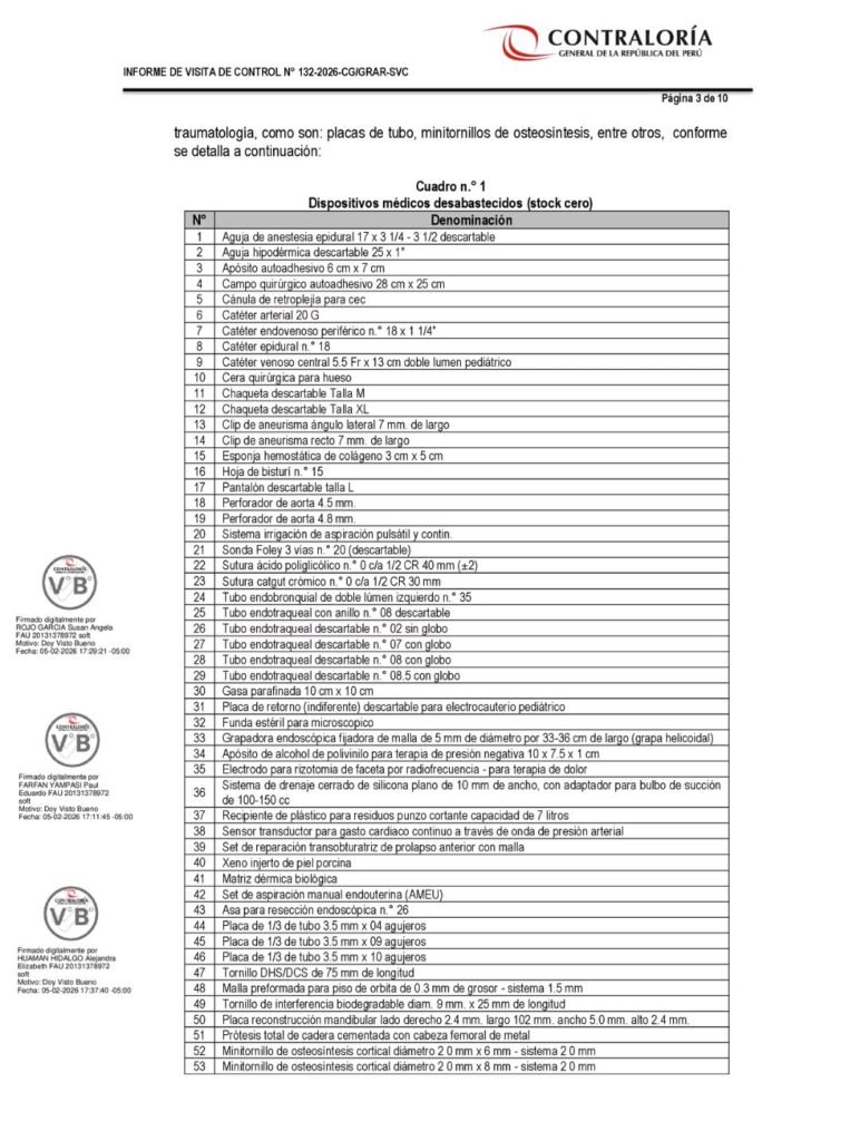 La Contraloría expone desabastecimiento crítico de dispositivos y medicinas en nosocomio. Estos hallazgos ocurrieron bajo la gestión de la exgerente de EsSalud, Guadalupe Mamani Juárez.