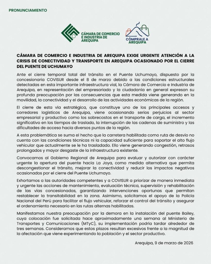La Cámara de Comercio e Industria de Arequipa demandó la apertura inmediata de la carretera Arequipa – La Joya como medida urgente para mitigar la crisis de transporte y conectividad generada por el cierre total del puente Uchumayo, dispuesto por la concesionaria COVISUR desde el 8 de marzo debido a problemas estructurales