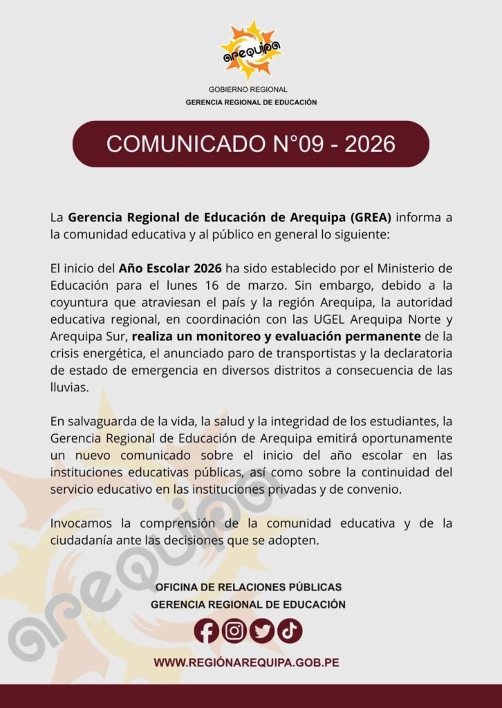La Gerencia Regional de Educación de Arequipa (GREA) informó que el inicio del Año Escolar 2026, fijado por el Ministerio de Educación para el lunes 16 de marzo, se encuentra actualmente en evaluación debido a la coyuntura que atraviesan el país y la región.