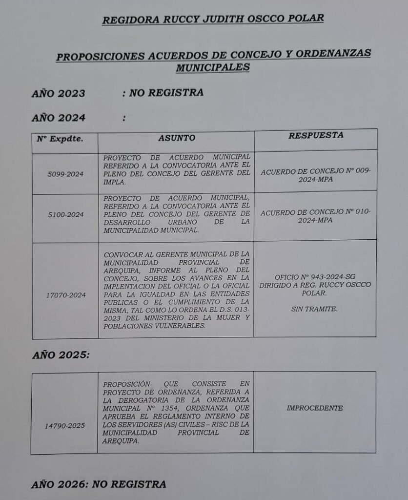 Durante todo el 2023, Oscco Polar no presentó ni una sola propuesta legislativa. El año siguiente, diremos que —en ese sentido— fue un poco más productiva porque se reportan tres propuestas. Dos fueron acuerdos municipales para convocar a funcionarios.
