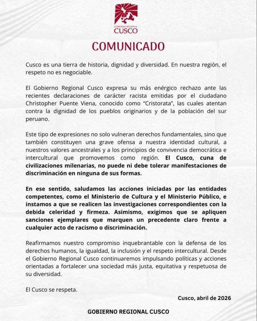 En paralelo, el Gobierno Regional Cusco emitió un contundente comunicado rechazando las declaraciones del streamer y exigiendo sanciones.