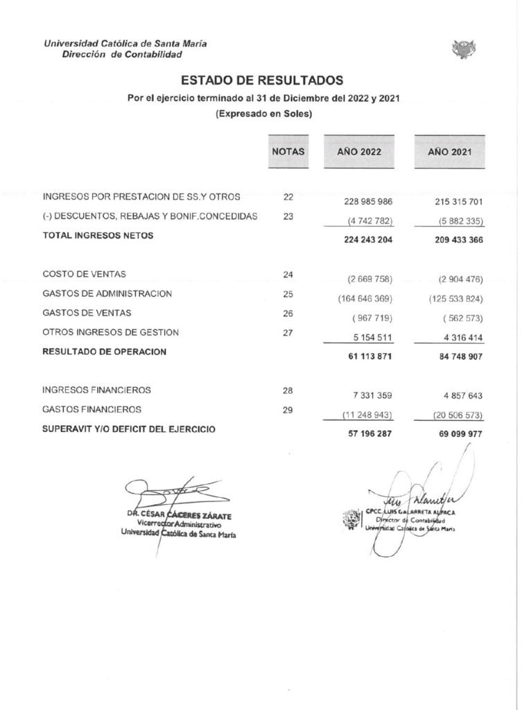 En 2021, la UCSM registró ingresos netos por 209 millones 433 mil 366 soles, con un Superavit (o ganancia real) de 69 millones 099 mil 977 soles. En 2022, los ingresos netos aumentaron a 224 millones 243 mil 204 soles, pero la ganancia se redujo a 57 millones 196 mil 287 soles. La explicación es simple: aunque se recaudó más, los gastos crecieron de manera significativa, especialmente en el rubro administrativo. Esta tendencia se acentuó en los años siguientes.