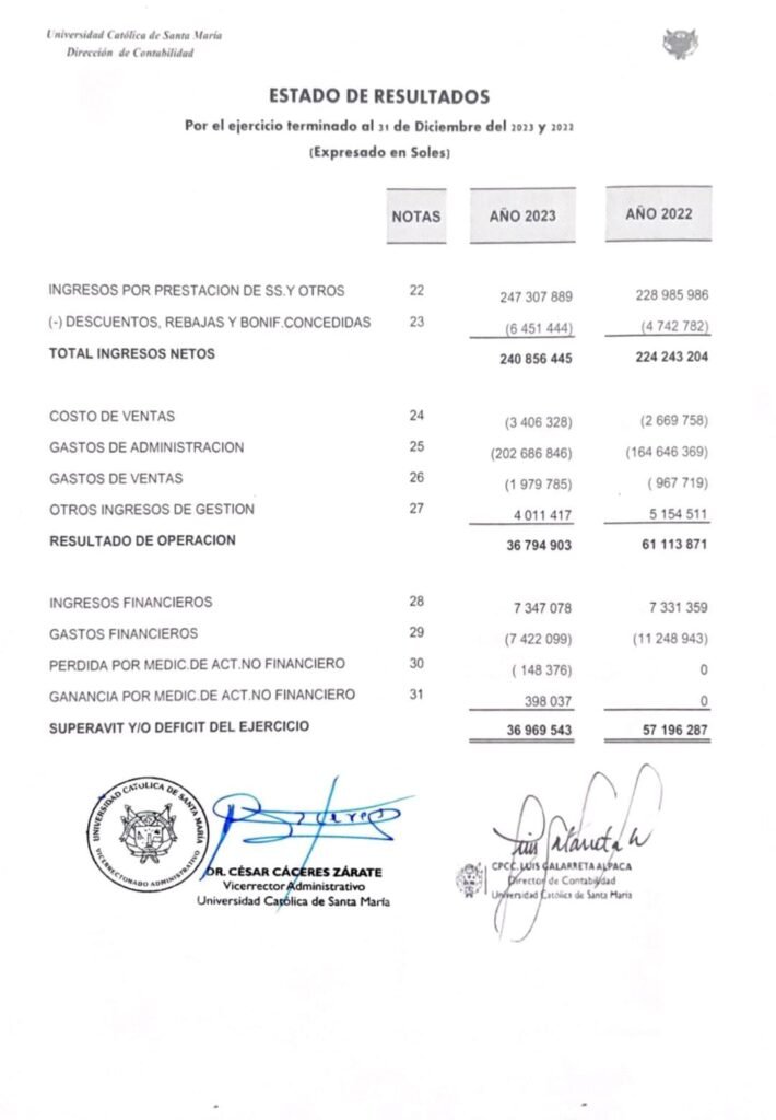 En 2023, los ingresos netos ascendieron a 240 millones 856 mil 445 soles, pero la utilidad final cayó a 36 millones 969 mil 543 soles, marcando un nuevo retroceso financiero pese al aumento de la recaudación, nuevamente generado por mayores gastos administrativos. Es decir, pago de planillas, beneficios, bonos y demás. Precisamente, ya se había advertido que los directivos en conjunto de la casa superior de estudios, en 2025, recibieron alrededor de 10.8 millones de soles en bonos.