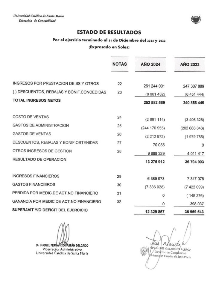 Ahora bien, para 2024, último año con información de los estados financieros publicado en el portal de transparencia, la universidad alcanzó ingresos netos por 252 millones 582 mil 569 soles. Sin embargo, el superavit (ganancia) final fue de apenas 12 millones 329 mil 857 soles, una caída drástica frente a años anteriores.