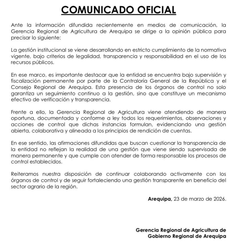 “La entidad se encuentra bajo supervisión y fiscalización permanente por parte de la Contraloría y el Consejo Regional de Arequipa (CRA). Esta presencia de los órganos de control garantiza un seguimiento continuo a la gestión y constituye un mecanismo efectivo de verificación y transparencia”, se lee en el pronunciamiento.