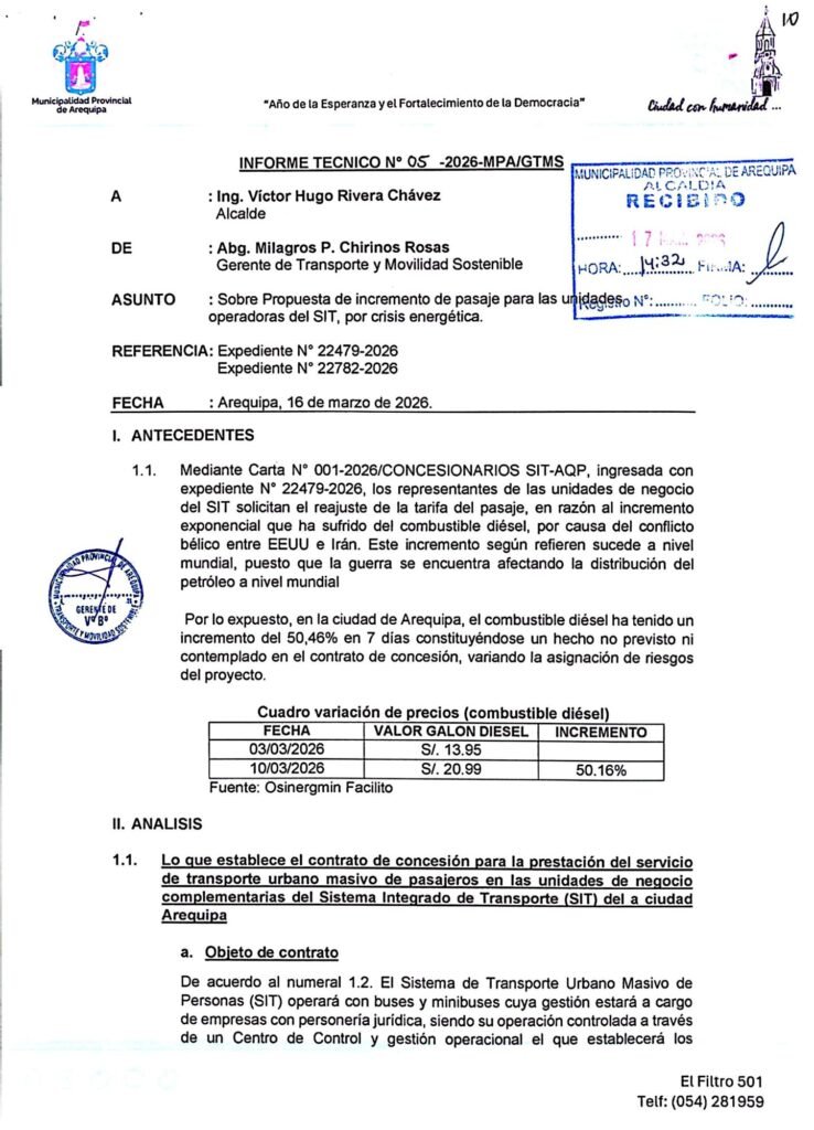 Según el Informe Técnico 05-2026-MPA/GTMS al que accedió Evidencia.pe —el mismo que será motivo de debate en la sesión de Concejo de este jueves por la tarde—, las reglas de ajuste tarifario varían según la etapa; mientras que en la etapa operativa existen fórmulas de ajuste periódico, en la etapa pre-operativa la tarifa tiende a mantenerse congelada para proteger al usuario.