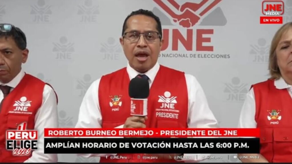 El presidente del Jurado Nacional de Elecciones, Roberto Burneo, anunció la ampliación del horario de votación hasta las 6:00 p. m., a raíz de los retrasos registrados en la instalación de mesas de sufragio.