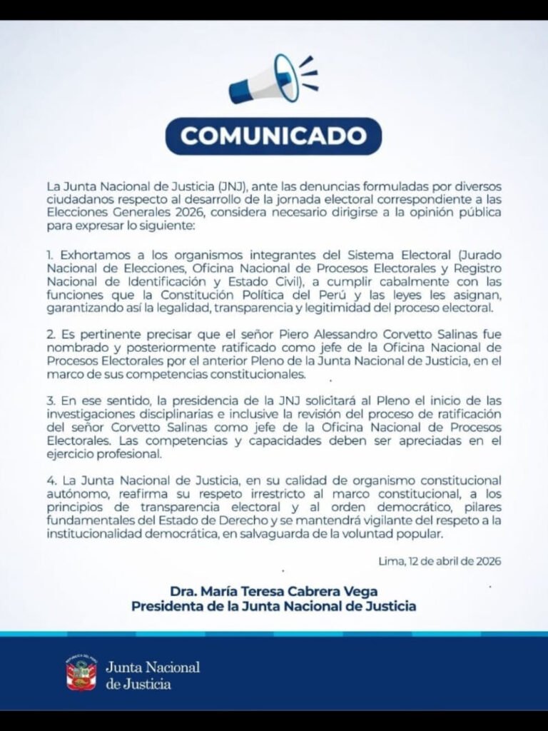 La Junta Nacional de Justicia anunció que solicitará al pleno iniciar una investigación contra el jefe de la ONPE, Piero Corvetto, debido a la demora en la instalación de mesas durante las primeras horas de las Elecciones 2026.El comunicado señala que Corvetto fue ratificado por una anterior conformación de la JNJ y que se evaluará su continuidad en el cargo. Asimismo, exhortó al Jurado Nacional de Elecciones, a la ONPE y al Reniec a cumplir la ley y la Constitución para garantizar el normal desarrollo del proceso electoral.