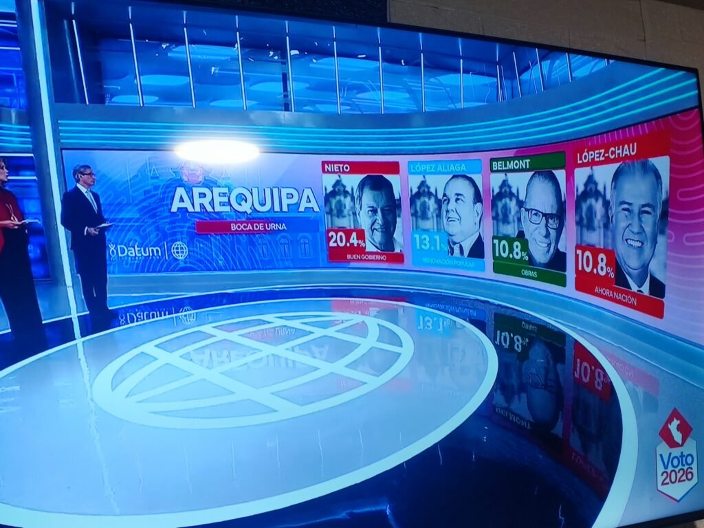 Los primeros resultados a boca de urna en Arequipa ubican al candidato presidencial de Buen Gobierno, Jorge Nieto Montesinos, en el primer lugar de las preferencias.Estos resultados son preliminares y deberán ser confirmados con el conteo oficial de votos conforme avance el proceso electoral.