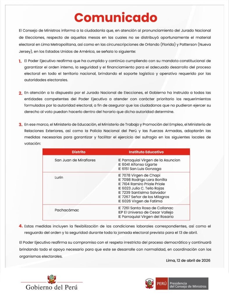 El Consejo de Ministros informó a la ciudadanía que, en atención al pronunciamiento del Jurado Nacional de Elecciones, se han identificado mesas de sufragio en las que no se distribuyó oportunamente el material electoral en Lima Metropolitana, así como en las circunscripciones de Orlando (Florida) y Patterson (Nueva Jersey), en Estados Unidos.