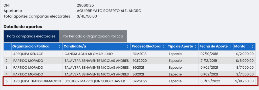 El nombre de Roberto Alejandro Aguirre Yato no es desconocido para varios políticos. En 2022, cuando Sergio Bolliger postulaba al sillón distrital de Yanahuara, aportó la suma de S/ 18 mil 750 a su candidatura por el movimiento regional Arequipa Transformación. Quizá ahora se entienda el por qué de su amistad.
