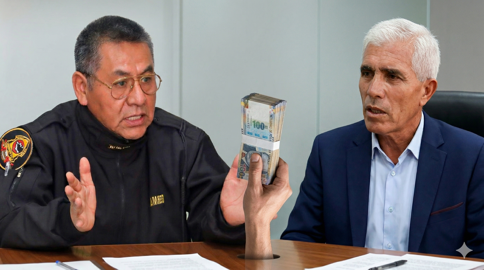 Bolliger no dice para qué era la plata, y Torres negó a Aguirre, pero este sí facturó con comuna de Miraflores. Composición generada con IA.