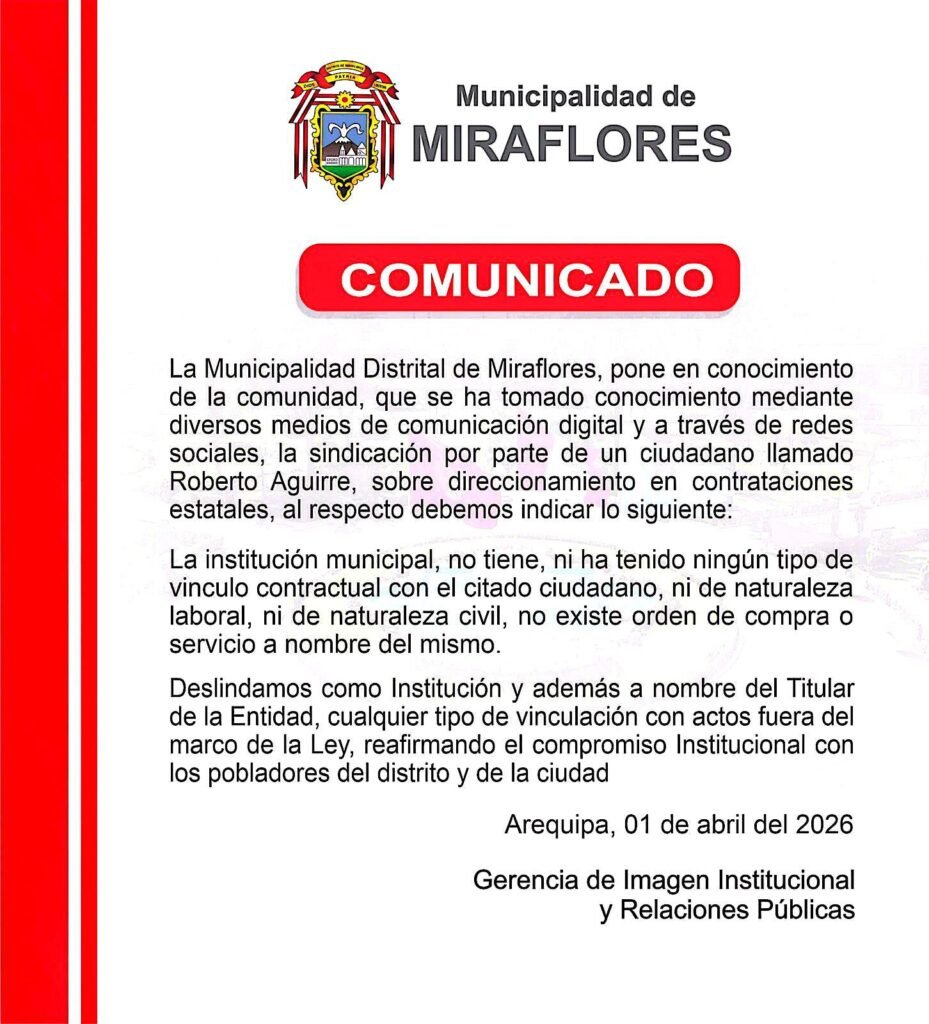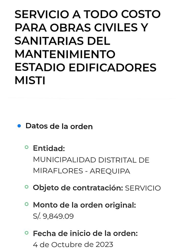 Evidencia.pe, tras revisar el Sistema Electrónico de Contrataciones con el Estado (SEACE), descubrió que la firma obtuvo una orden de servicio con la comuna de Miraflores. Se trata de un servicio a todo costo para obras civiles y sanitarias en el mantenimiento del estadio Edificadores del Misti, por un monto de S/ 9 mil 849.09, adjudicado el 4 de octubre de 2023, cuando el burgomaestre ya había asumido el cargo.