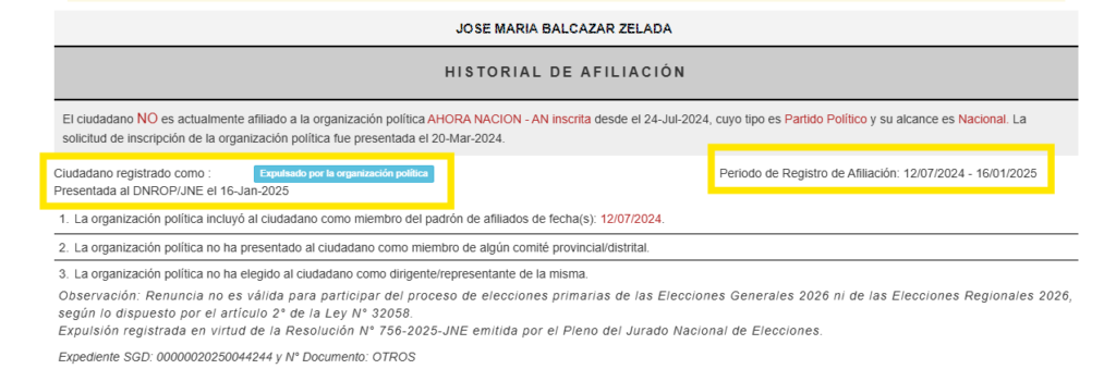 Las mismas fechas (julio de 2024 y enero del 2025) figuran en el Observatorio para la Gobernabilidad – Infogob, del JNE. En este registro se especifica igualmente que Balcázar fue “expulsado por la organización política” Ahora Nación.