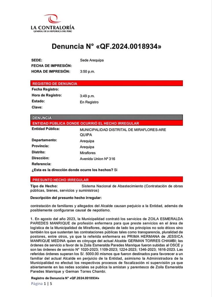Pero eso no es todo. La gestión de Germán Torres también contrató a Fabricio Antolín Luna Galdós para la Gerencia de Desarrollo Urbano. Este último es pareja de la ya mencionada Zoila Esmeralda Paredes Manrique, prima hermana de su esposa.