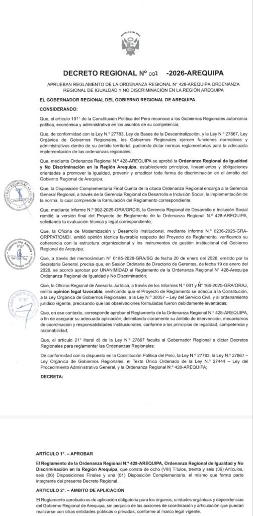 El Gobierno Regional de Arequipa (GRA) puso finalmente en vigencia la Ordenanza Regional N.º 428, orientada a prevenir y sancionar el racismo y toda forma de discriminación dentro de la institución, sobre a todo a la comunidad LGTBIQ+. La implementación se concretó mediante el Decreto Regional N.º 001-2026-Arequipa, tras una denuncia que exigía su cumplimiento y que concluyó en un Juzgado Constitucional de la Corte de Justicia.
