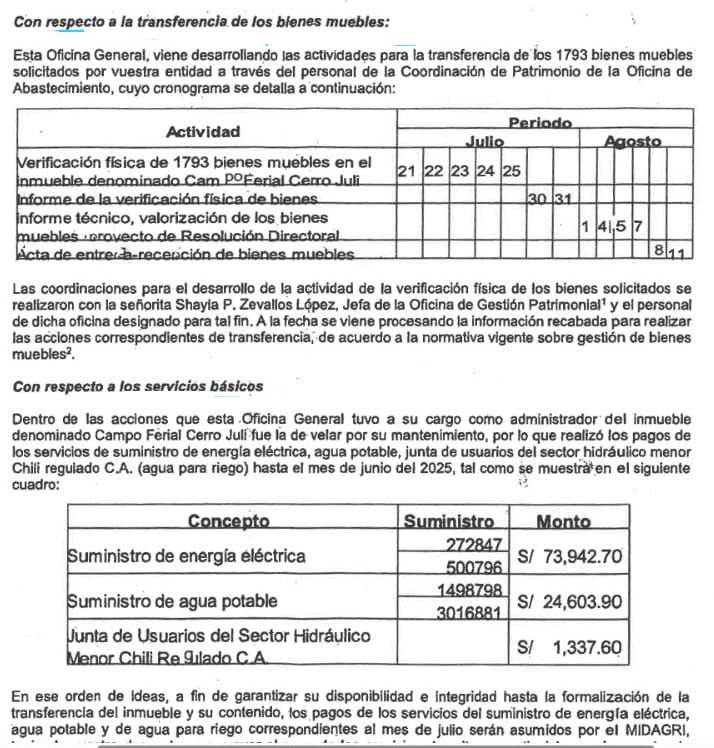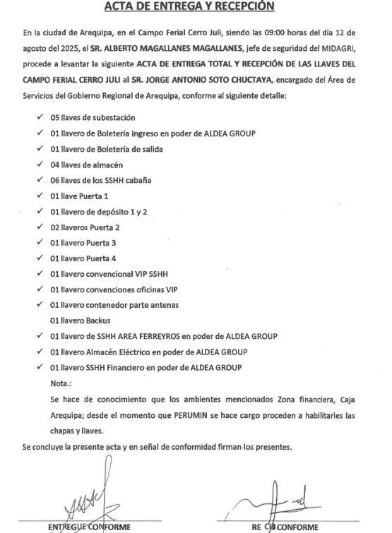 A ello se suma un acta de entrega y recepción fechada el 12 de agosto de 2025, en la que se deja constancia de la transferencia física del recinto. En dicho documento, el jefe de Seguridad del Midagri, Alberto Magallanes, entregó las llaves y control de diversas áreas a  Jorge Soto Chuctaya, encargado del área de Servicios del GRA; incluyendo accesos a subestaciones, almacenes, servicios higiénicos y boleterías.