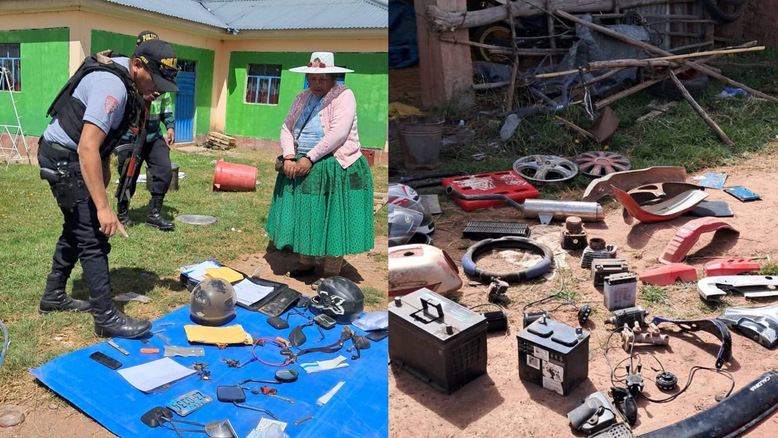 Intervención policial y fiscal permitió recuperar una moto robada y hallar otros vehículos, placas y autopartes en un inmueble vinculado al alcalde de Alto Patacollo. Una mujer fue detenida por presunta receptación agravada.