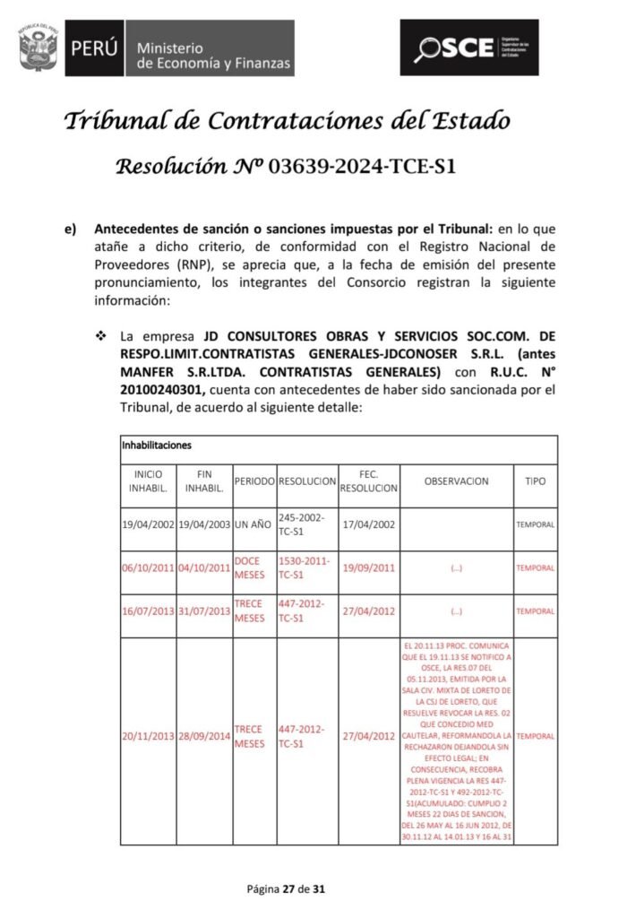 En 2021, la Resolución N° 0372-2021-TCE-S3 sancionó al Consorcio JCP, integrado por ECADA S.A.C. y JD Consultores Obras y Servicios S.R.L. —antes Manfer S.R.L.— por negarse a suscribir un contrato adjudicado por el Pronied en la región Piura. En ese caso, JDCONOSER fue multada con S/ 1,433,500 y suspendida por hasta nueve meses, hasta cumplir con el pago de la multa impuesta.