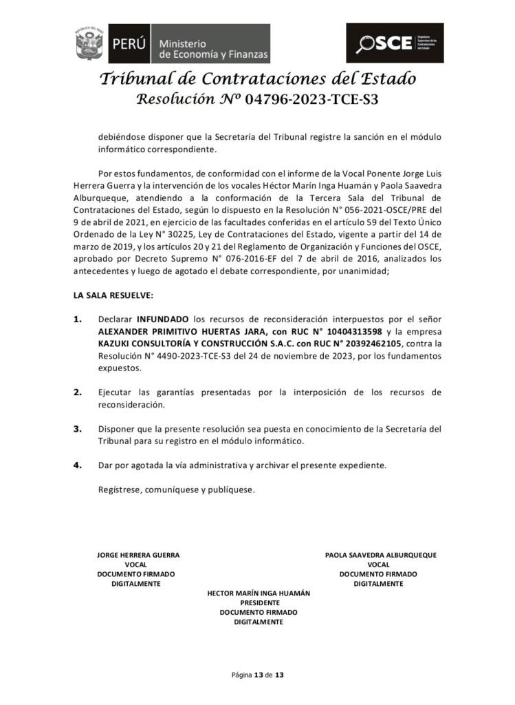 En principio, mediante la Resolución N° 04796-2023-TCE-S3, en 2023, el Tribunal confirmó una inhabilitación de ocho meses contra los integrantes del Consorcio Rímac, conformado por Kazuki Consultoría y Construcción S.A.C. y Alexander Primitivo Huertas Jara.