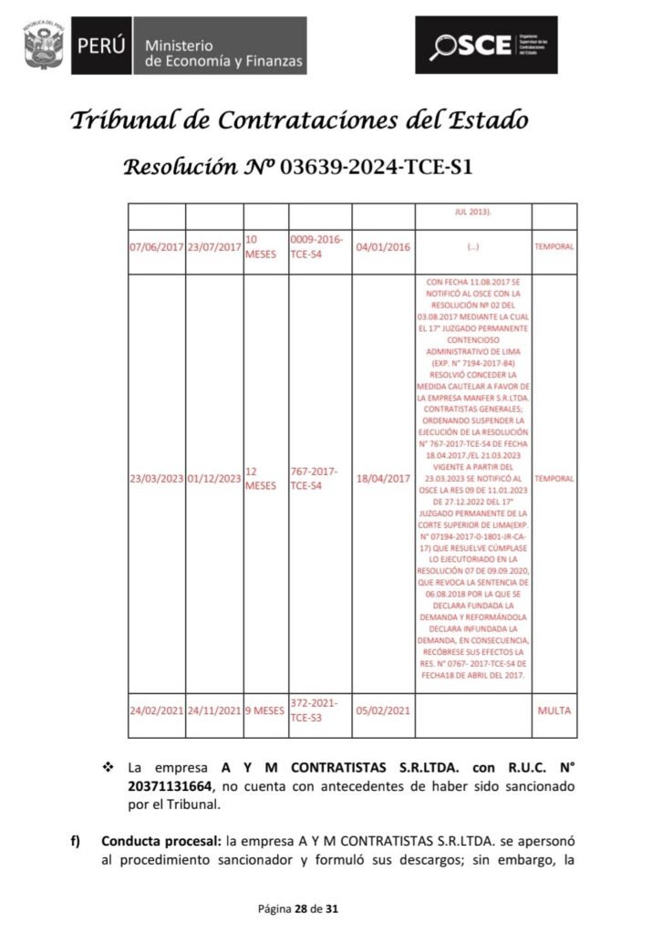 Posteriormente, en 2017, la Resolución N° 0767-2017-TCE-S4 ratificó una inhabilitación de doce meses contra Manfer S.R.L. por presentar información inexacta en una licitación convocada por SEDAPAR S.A. El Tribunal concluyó que la empresa presentó un certificado de experiencia profesional con datos inconsistentes respecto al periodo de desempeño de un ingeniero, generando una ventaja indebida en el proceso.