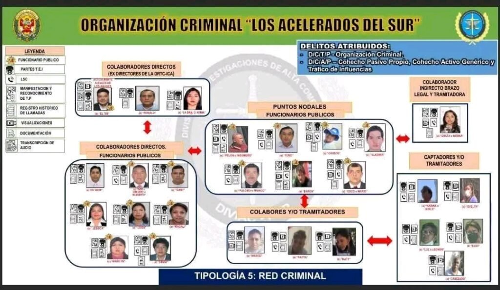 La Primera Sala Penal de Apelaciones de la Corte Superior de Justicia de Ica ordenó 12 meses de prisión preventiva contra exfuncionarios de la Dirección Regional de Transportes y Comunicaciones (DRTC) y particulares investigados por presuntamente integrar la organización criminal denominada “Los Acelerados del Sur”, dedicada al trámite irregular de licencias de conducir en la región Ica.