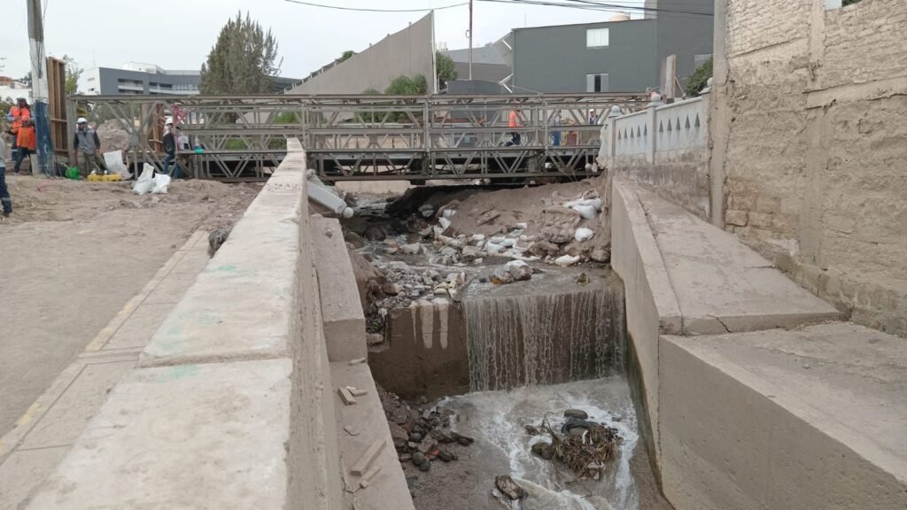 Otro aspecto crítico es la falta de encauzamiento adecuado del flujo de agua. Se observa un cauce completamente desnivelado y obstruido. Esto genera un acortamiento del mismo que podría desbordar en una próxima temporada pluvial. Hasta el momento, no se realizó la necesaria nivelación ni la profundización y, por consiguiente, incrementa el riesgo de erosión o socavación en las bases estructurales.