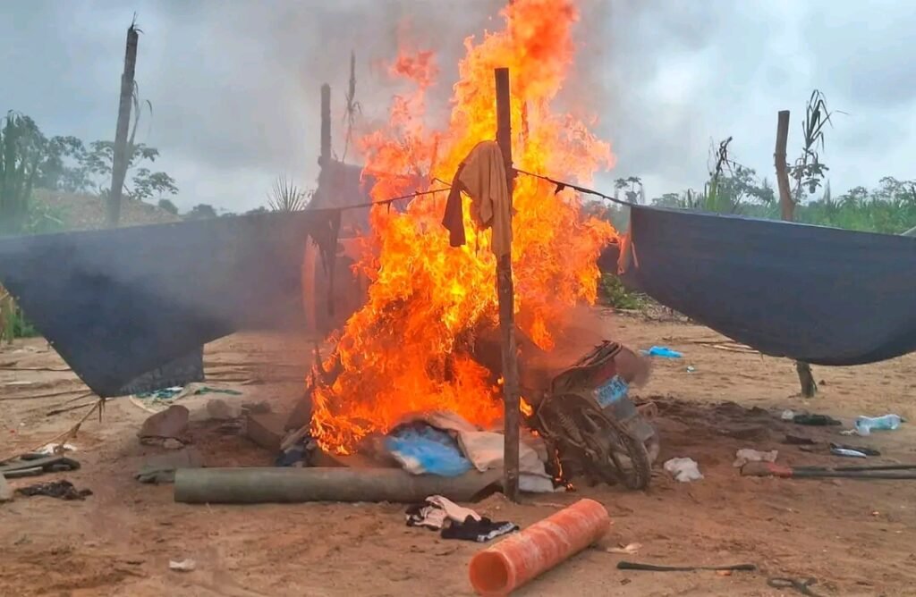 Maquinaria empleada para la extracción ilegal de oro fue incinerada por las autoridades.