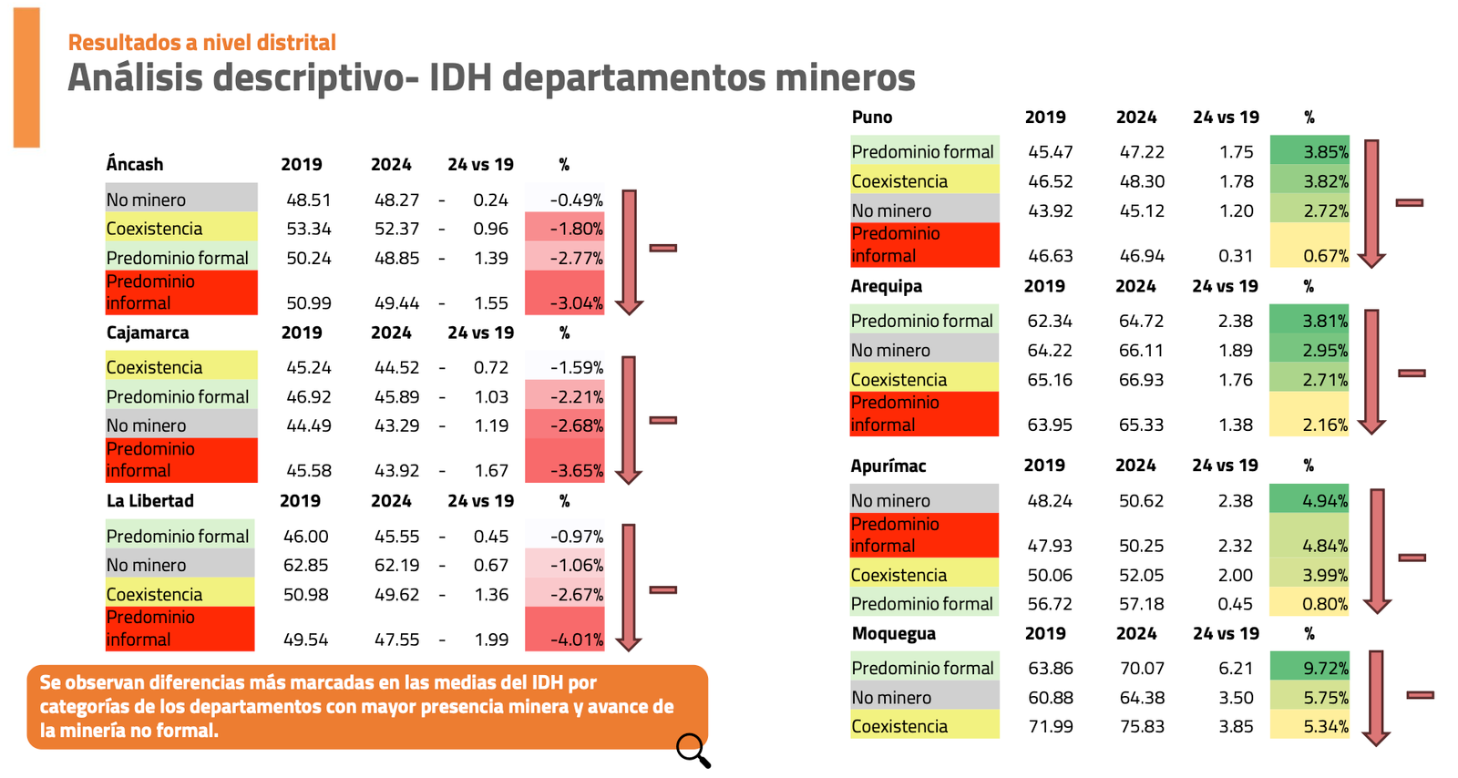 El informe, elaborado durante 2025 y presentado este año, analizó la evolución del Índice de Desarrollo Humano (IDH) en distritos del país con distintos tipos de actividad minera. Para identificar la presencia de minería formal, informal o mixta, los investigadores cruzaron cuatro registros oficiales: el catastro del REINFO y GEOCATMIN, el mapa de distribución del canon minero del Ministerio de Economía y Finanzas, el registro del INGEMMET y la distribución territorial del INEI.