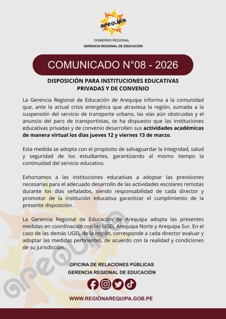 La medida se adopta debido a la crisis energética que atraviesa la región, la suspensión del servicio de transporte urbano, las vías aún obstruidas y el anuncio del paro de transportistas.Según el comunicado N.º 08-2026, la decisión busca salvaguardar la integridad y seguridad de los estudiantes, garantizando al mismo tiempo la continuidad del servicio educativo.