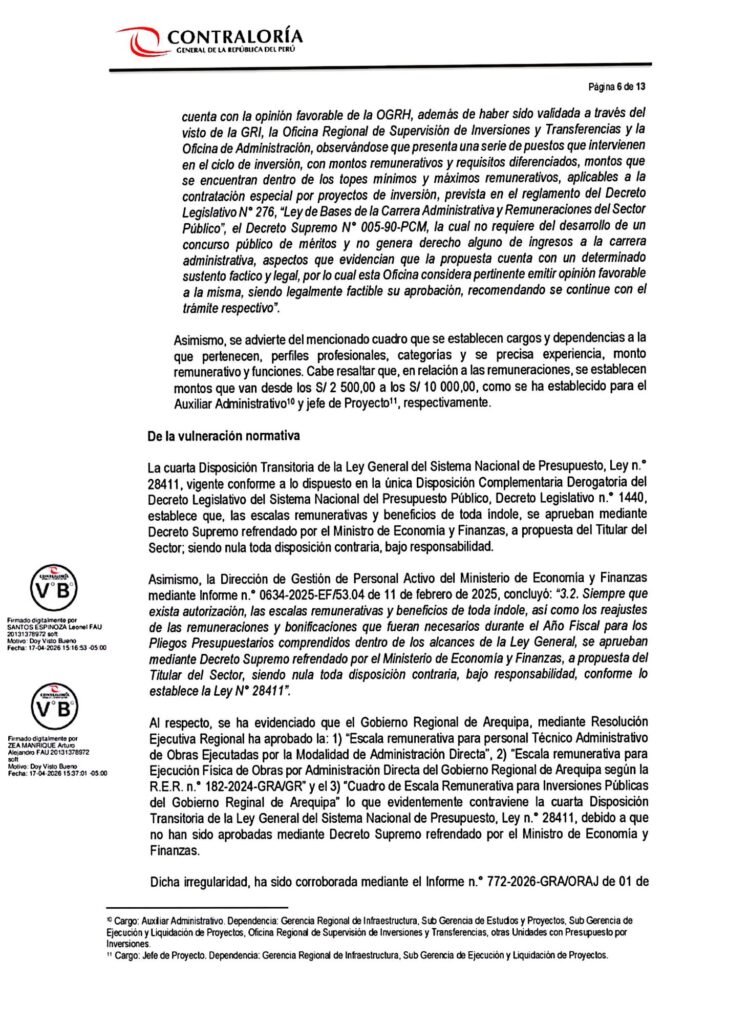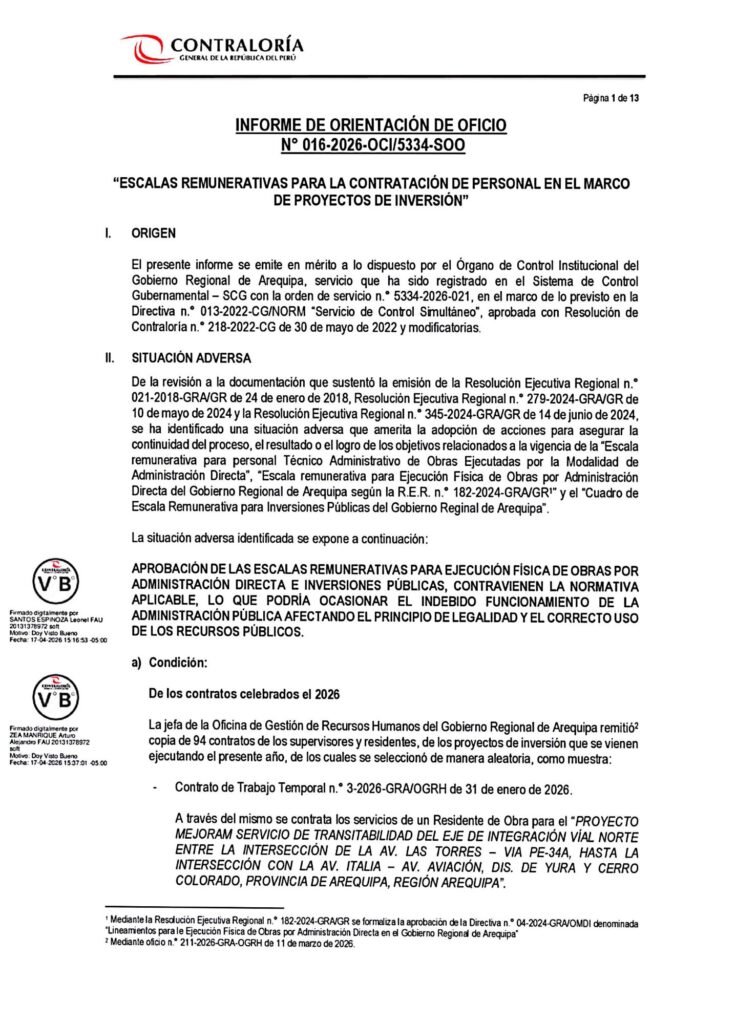 Por último, el ente de control analizó la remuneración del residente de obra del proyecto de mejoramiento del servicio de la educación primaria de la Institución Educativa Villa Don Jorge, en la provincia de Camaná. Su Contrato Temporal N° 41-2026-GRA/OGRH establece un pago de S/ 8 mil mensuales.
