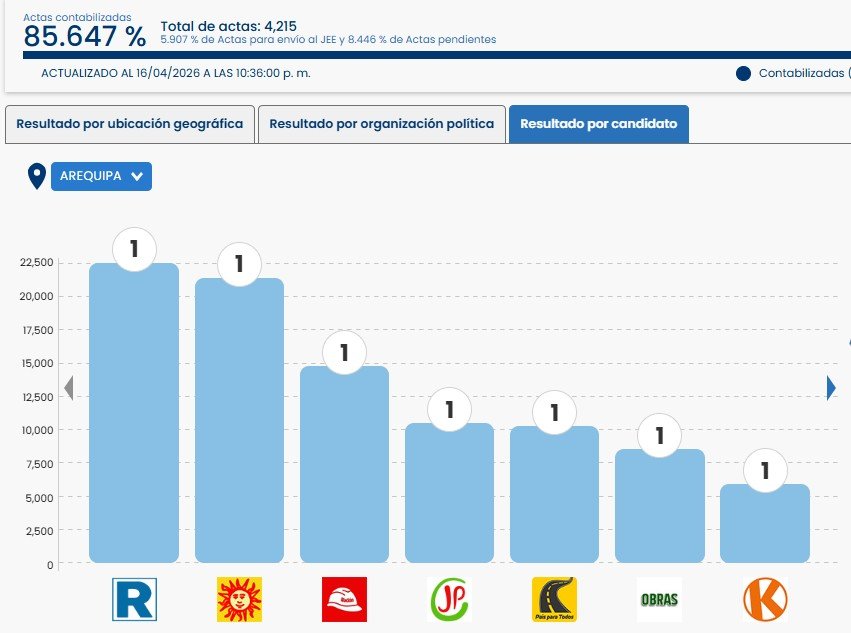 De ese modo, a pesar que Ricardo Ramírez del Villar de Renovación Popular contabiliza 22 mil 498 votos preferenciales, el llamado a ocupar la curul en representación de Arequipa -hasta el momento- sería Nilson Flores Suárez de partido del Sol, quien actualmente registra 21 mil 394 votos.