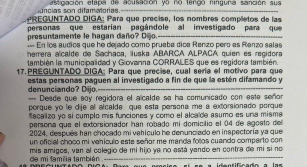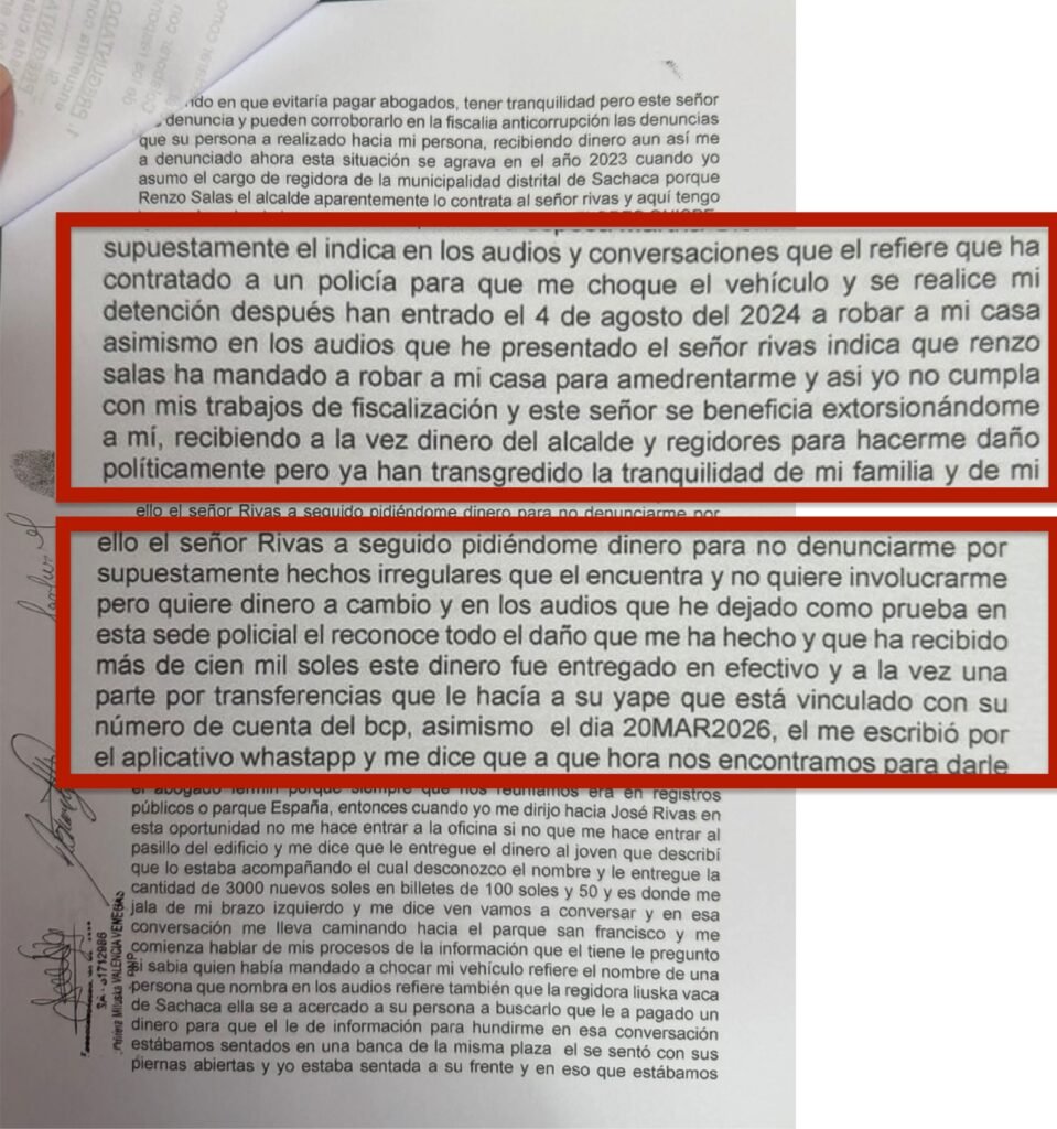 Un complejo trabajo de extorsión, hostigamiento y presuntas colusiones políticas ha salido a la luz en el distrito de Sachaca. La regidora y teniente alcalde, Lania Ninoska Miranda Reinoso, ha formalizado una denuncia penal contra José Rivas Durand, quien fue intervenido por la Policía Nacional el pasado sábado 21 de marzo, por el presunto delito de extorsión. En la denuncia trasciende un elemento que pone en la mira al propio alcalde del distrito Renzo Salas Herrera, y otras dos regidoras, como supuestos financistas de Rivas Durand. De acuerdo con el testimonio de Lania Miranda, sustentado en audios que entregó a la Policía, Rivas habría recibido dinero con el fin de extorsionarla y hostigarla con denuncias difamatorias ante la Fiscalía. El pago hacia Rivas se habría concretado mediante la contratación de su esposa, Martha Flores Quispe, en la comuna de Sachaca.