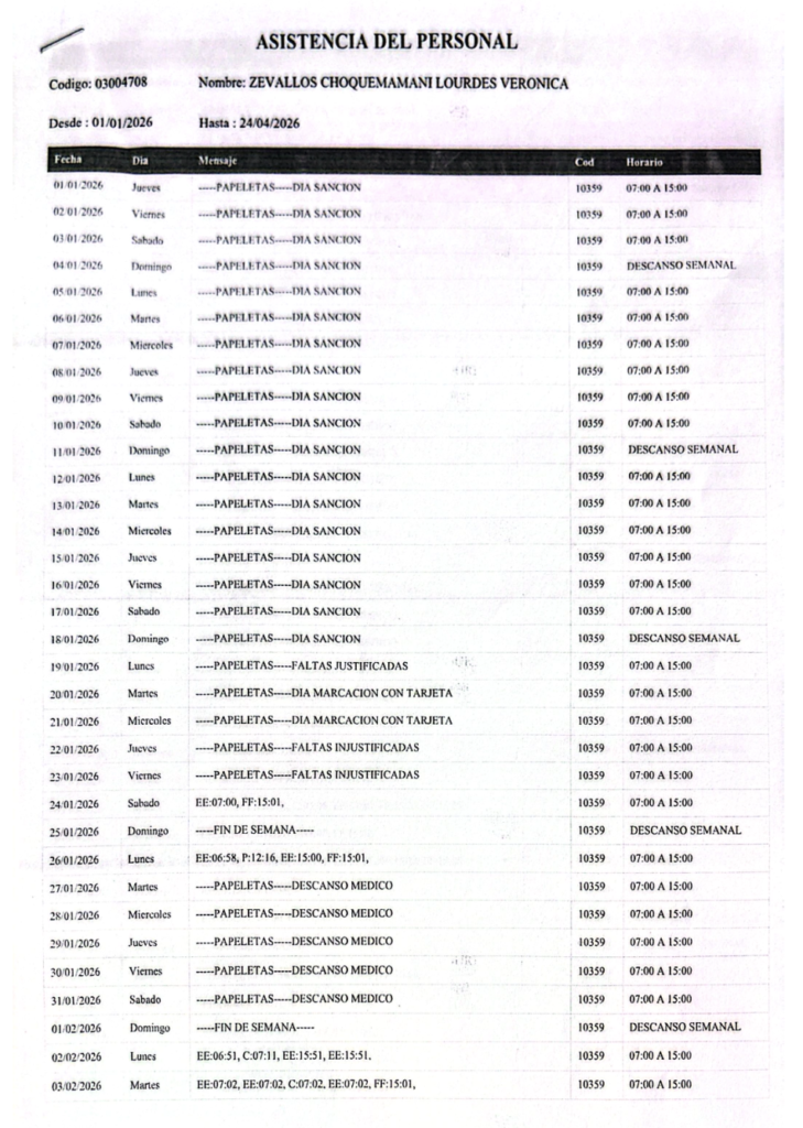 Los registros de asistencia y expedientes disciplinarios de la servidora Lourdes Zevallos Choquemamani muestran un historial de faltas reiteradas, suspensiones acumuladas y más de 420 días sin servicio efectivo en los últimos 3 años.