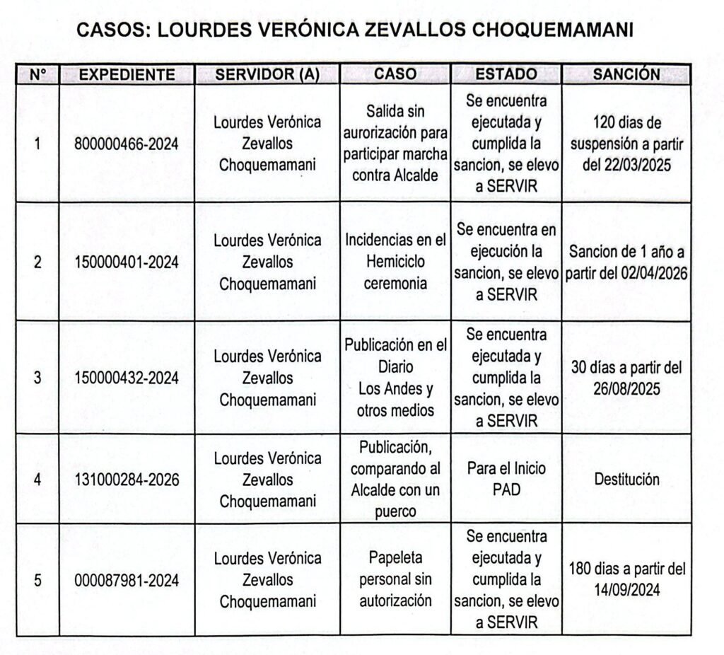 Actualmente, se cumple una sanción de un año por “incidencias en el hemiciclo durante una ceremonia institucional”, que fue impuesta en contra de Zevallos el 2 de abril de este años. Mientras que un quinto expediente, iniciado este año, se encuentra en etapa inicial y contempla la destitución por una publicación que comparó al burgomaestre con un animal. En todos los casos resueltos, la trabajadora apeló ante el Servicio Civil (SERVIR), organismo que en algunas instancias retrotrajo los procedimientos, aunque la municipalidad sostiene que las faltas son reiteradas y afectan la continuidad del servicio.