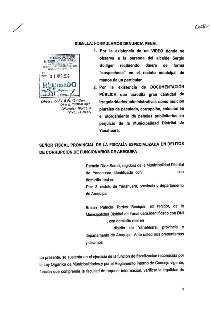El video donde se observa al alcalde de Yanahuara, Sergio Bolliger Marroquín, recibiendo dinero solo fue la punta del iceberg. Y es que la regidora Pamela Díaz Sarolli y el vacado regidor Braian Torrico Benique formalizaron una denuncia ante la Fiscalía Especializada en Delitos de Corrupción de Funcionarios de Arequipa al detectar convenios irregulares para la instalación de paneles publicitarios.