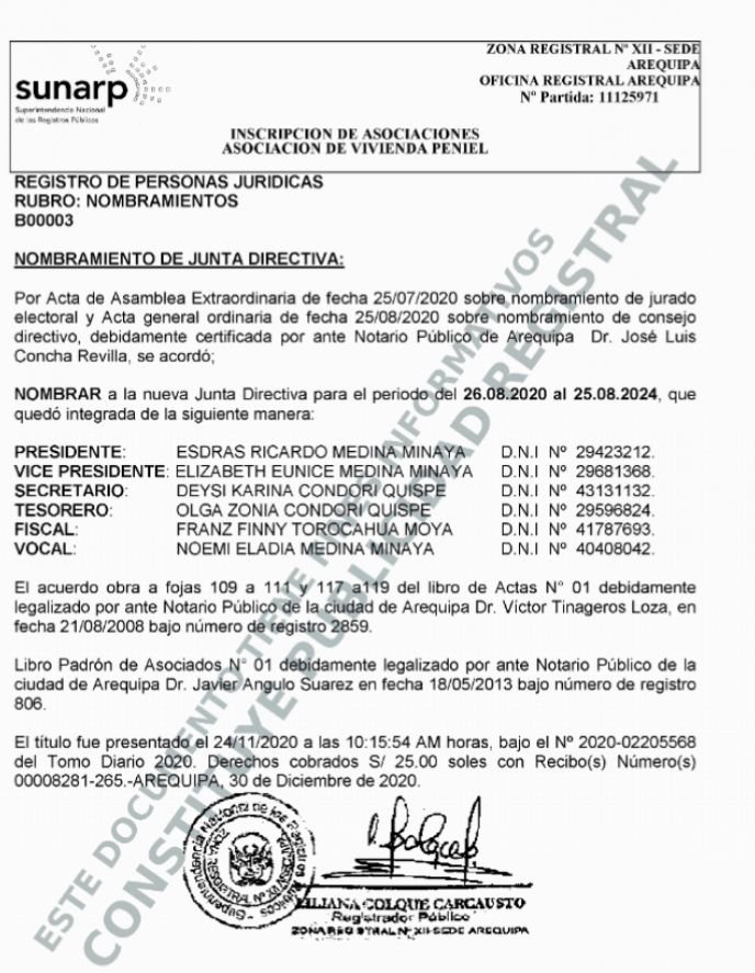 Los documentos de SUNARP revelan una red de poder que se ha mantenido por más de 15 años. La Asociación de Vivienda Peniel, constituida en 2008, tiene como fines principales «gestionar la adjudicación y/o compra de terrenos para sus asociados» y «realizar la habilitación urbana». Las partidas registrales muestran un patrón familiar y político, desde 2008 hasta 2016, Olga Zonia Condori Quispe ejerció como presidenta de la asociación, mientras que Esdras Medina ocupaba la tesorería. Luego, en el año 2020, cuando Medina es elegido congresista, se produce un cambio estratégico: él asume la presidencia de la junta directiva para el periodo 2020-2024, y Condori pasa a la tesorería.