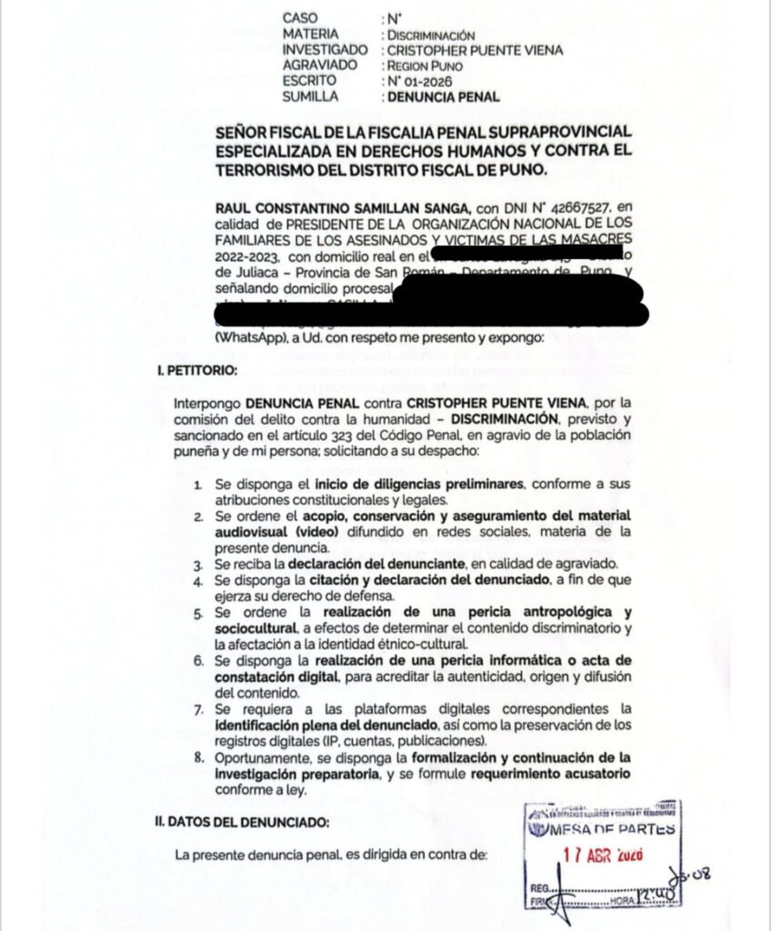 El caso del streamer Cristopher Puente Viena, conocido como “Cristorata”, continúa escalando en el ámbito judicial. A las denuncias ya presentadas en Cusco y Puno, ahora se suma una tercera acción penal interpuesta ante la Fiscalía Supraprovincial Especializada en Derechos Humanos en Puno, por presuntas expresiones discriminatorias difundidas en redes sociales.