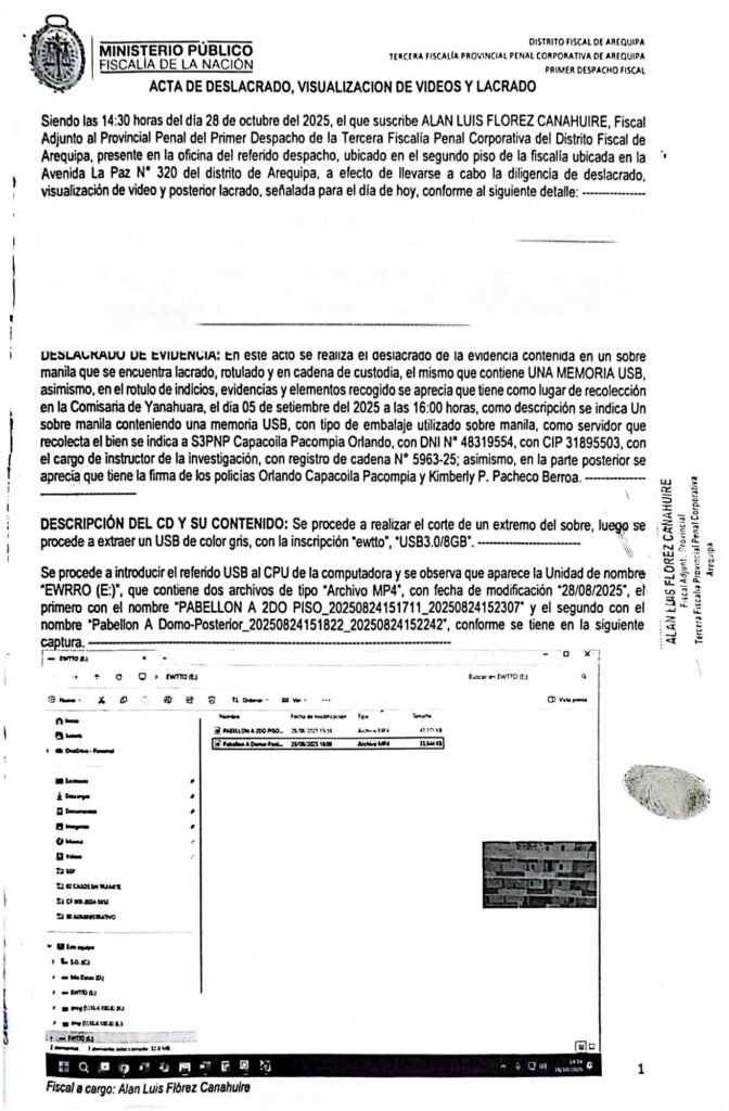 Sin embargo, el material entregado no correspondía al rango solicitado. Esta situación quedó consignada en el Acta de Deslacrado, Visualización de Videos y Lacrado realizada el 28 de octubre de 2025. Se dejó constancia que se abrió un sobre lacrado que contenía una memoria USB incautada en la comisaría de Yanahuara el 5 de septiembre de 2025. Al revisar el dispositivo se encontraron dos archivos de video en formato MP4 con fecha de modificación del 28 de agosto de 2025.