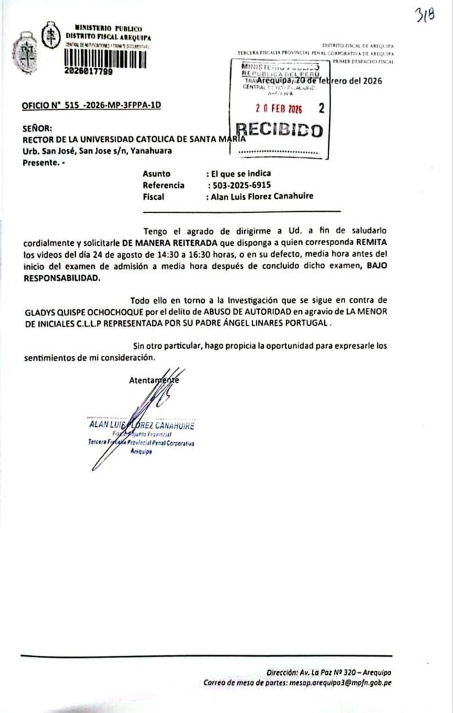 Ante esta situación, el fiscal del caso Alan Luis Flores Canahuire volvió a requerir la información. Mediante el Oficio N.° 515-2026-MP-3FPPA-1D, enviado el 20 de febrero de 2026, solicitó nuevamente al rector de la universidad que disponga la entrega de las grabaciones completas del 24 de agosto entre las 14:30 y 16:30 horas, o al menos desde media hora antes del inicio del examen hasta media hora después de su culminación, bajo responsabilidad.