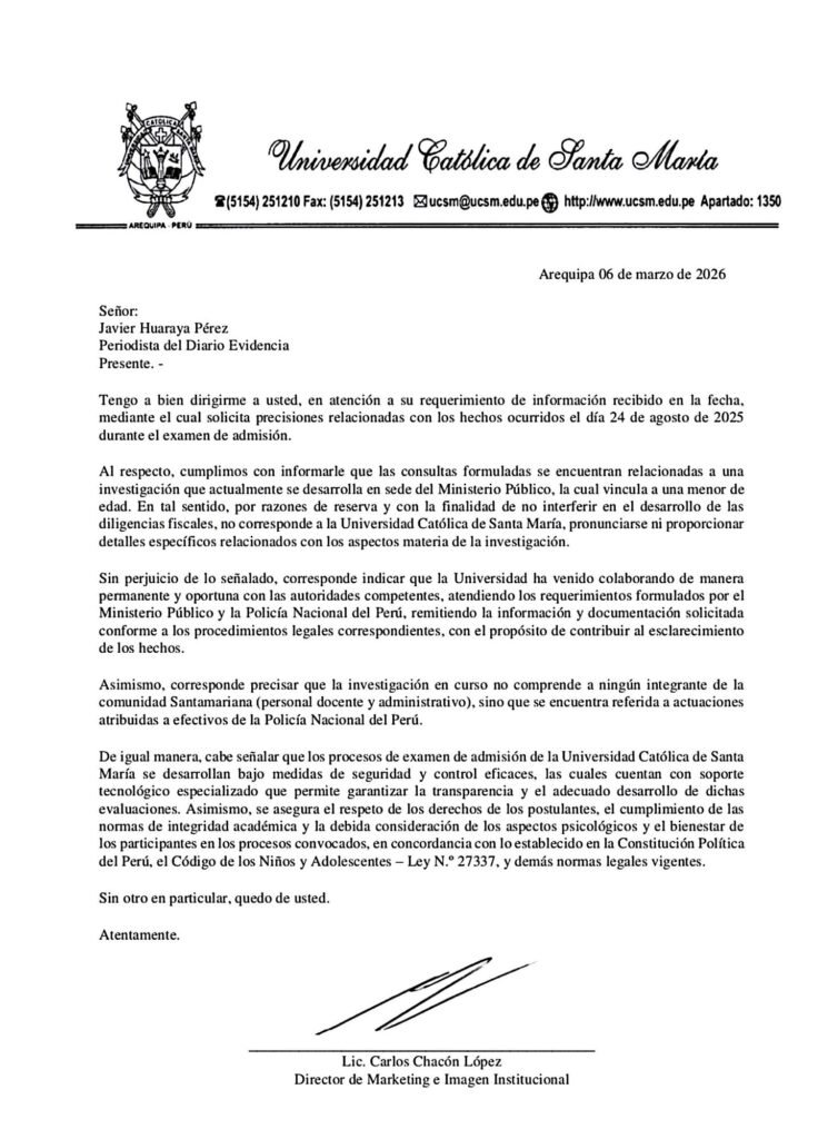 Consultada por este medio, la Universidad Católica de Santa María respondió a través de su área de Marketing e Imagen Institucional que el caso forma parte de una investigación en curso que involucra a una menor de edad, por lo que —señalaron— no corresponde pronunciarse ni brindar detalles específicos para no interferir en las diligencias fiscales.