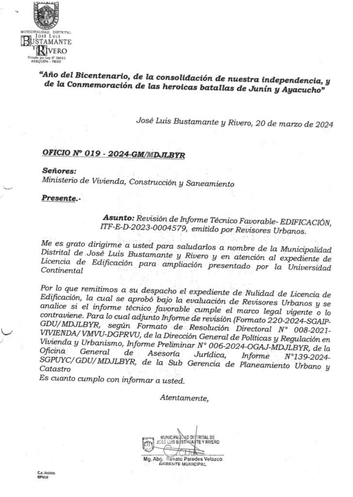 La controversia entre la Municipalidad Distrital de José Luis Bustamante y Rivero y la Universidad Continental, por la defensa de la campiña, añadió nuevos capítulos judiciales y administrativos. Tras el fallo del Poder Judicial, que anulaba la habilitación urbana en favor de la casa de estudios, la comuna procedió a anular las licencias de construcción del primer edificio. Y ante el panorama negativo para continuar con su expansión, la Continental decidió no hacer caso a las normas locales y acudir a la modalidad de Revisores Urbanos del Ministerio de Vivienda para construir su segundo edificio. Según el alcalde bustamantino Fredy Zegarra Black, presentaron un expediente parcializado obviando la sentencia definitiva de la Corte de Justicia. Y a pesar de la solicitud de la comuna para que se corrija su error, el Ministerio de Vivienda se mantiene en silencio.
