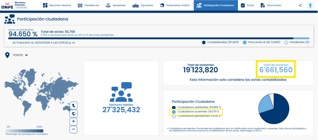 En el actual proceso electoral, al 94.650% del total de actas contabilizadas por la Oficina Nacional de Procesos Electorales (ONPE), el ausentismo registrado para la primera vuelta fue de 24,379 %, lo que equivale a un total de 6 ‘661.560 personas que no asistieron a votar.