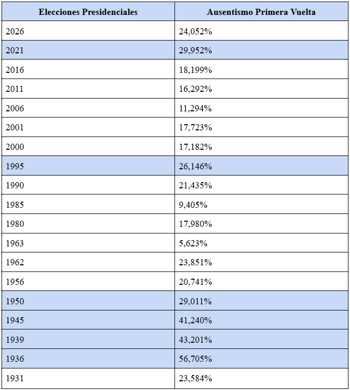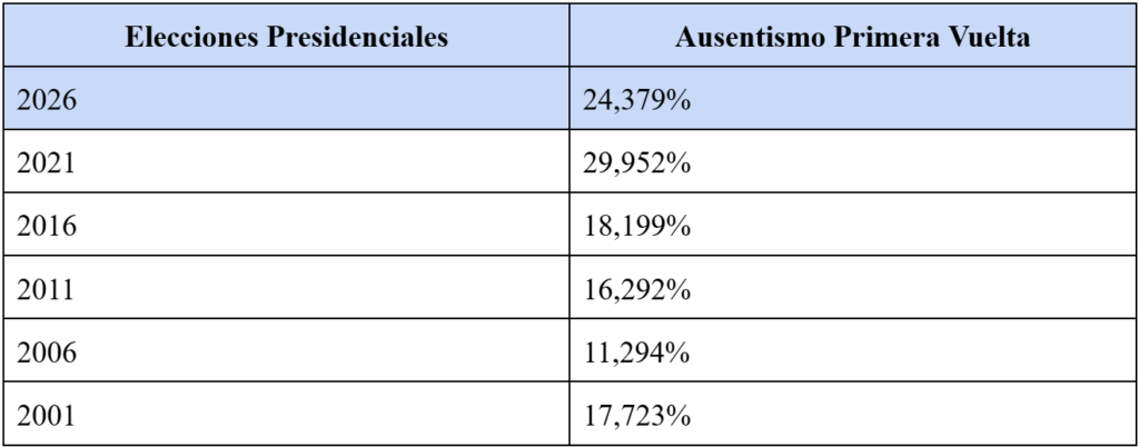 De hecho, como se evidencia en la siguiente tabla, en ninguna de las anteriores elecciones de este siglo ―a excepción del 2021― el ausentismo fue superior al registrado hasta ahora en esta primera vuelta.