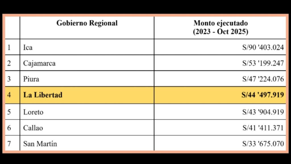 En realidad, durante la gestión de César Acuña ―entre el 2023 y octubre de 2025―, el Gobierno Regional de La Libertad (GORE) ejecutó un total de S/44’497.919 en seguridad ciudadana. Sin embargo, dicho monto fue superado ―en el mismo periodo― por los gobiernos regionales de Ica, Cajamarca y Piura.