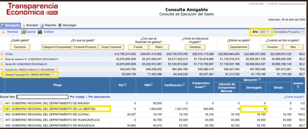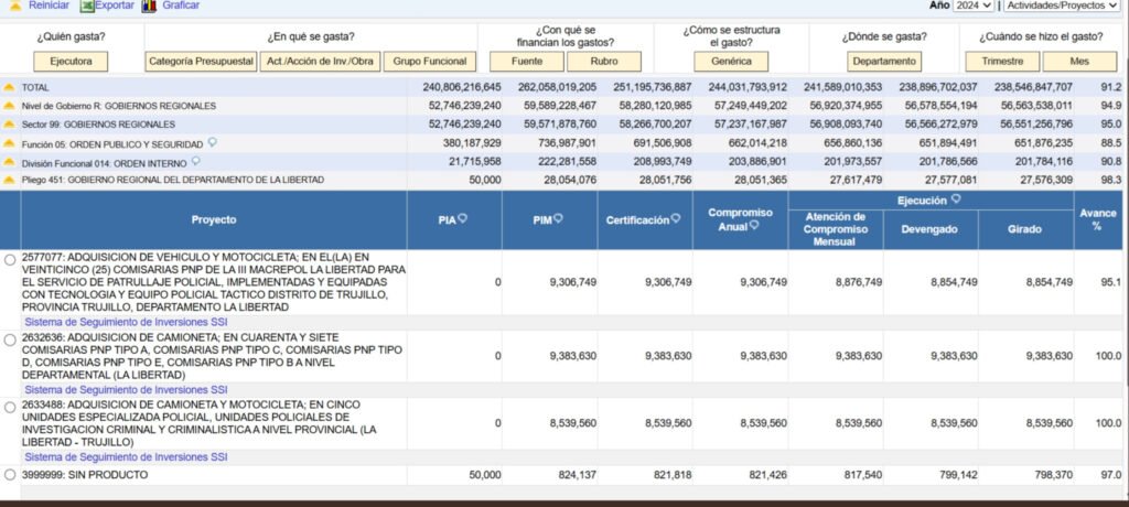 De acuerdo con el portal Consulta Amigable del MEF, entre enero de 2023 y octubre de 2025 ―periodo que abarca la gestión de César Acuña―, el GORE de La Libertad ejecutó, bajo esta división funcional, S/44’497.919 en seguridad ciudadana.