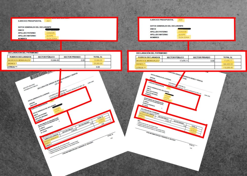 Sin embargo, las cifras patrimoniales muestran un salto considerable. En su declaración jurada del 2021, consignó apenas S/ 25 mil en bienes y ningún ahorro. Cuatro años después, al cierre del 2025, sus activos superan los S/ 514 mil, lo que representa un incremento superior al 2000% en un periodo relativamente corto.
